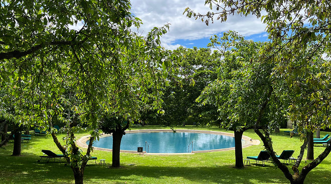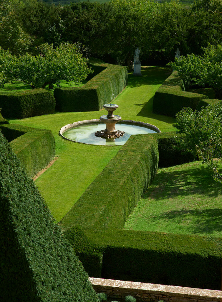 À l’extérieur, les jardins à la française dévoilent leurs allées géométriques face au verger de cerisiers et à la piscine aux allures de bassin romain.